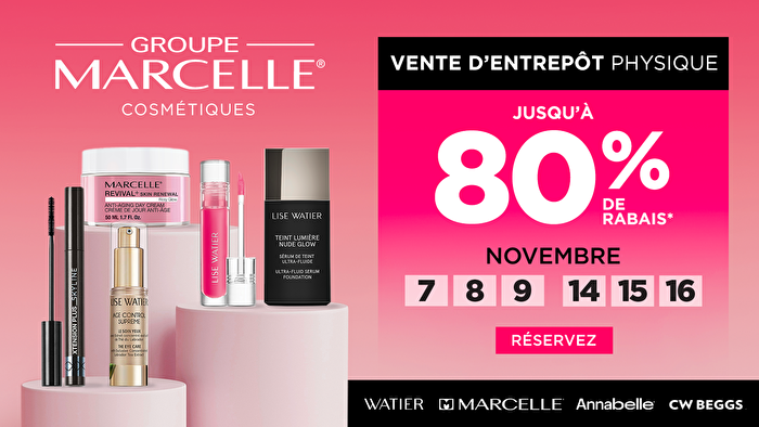 La vente d’entrepôt physique du Groupe Marcelle est de retour! Économisez jusqu’à 80% de rabais sur vos marques favorites: Watier, Annabelle, Marcelle et CW Beggs. Maquillage, soins de la peau et parfums.
