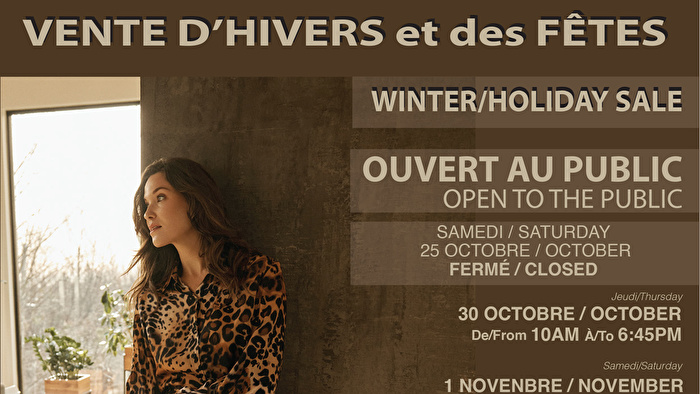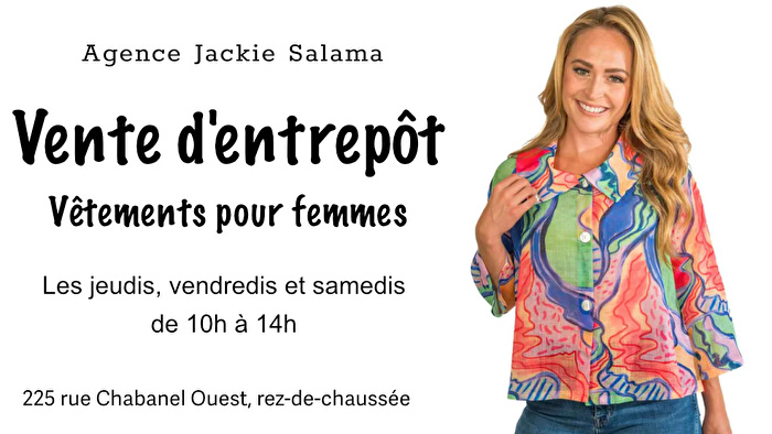 Grande vente de vêtements pour femmes de marques réputées par Agence Jackie Salama tous les jeudis, vendredis et samedis du mois de novembre! Venez profiter de prix avantageux dans les tailles 6 à 16.