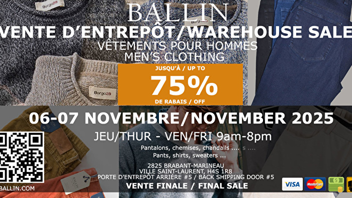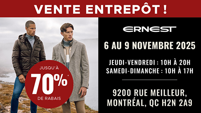 La Vente d’Entrepôt Ernest est de retour du 6 au 9 novembre 2025. Profitez de jusqu’à 70% de rabais sur une sélection de chandails, chemises, velours côtelés, complets, vestons, jeans, chinos et plus encore.