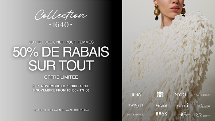 Vente 3 jours chez Collection 1640, outlet créateurs pour femmes! Liu-Jo, Twinset, Brax, Riani, Oui, Princess et plus, à prix exclusifs. Quantités limitées — à ne pas manquer!