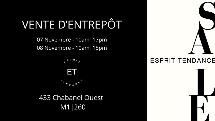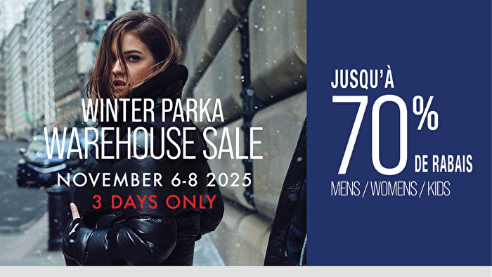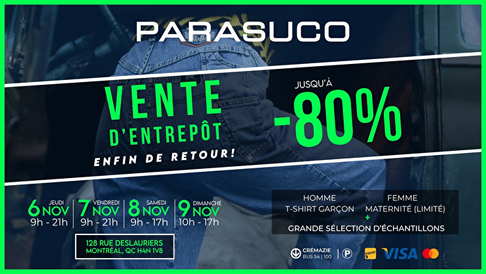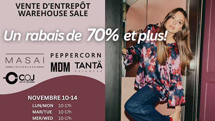 Notre fameuse Vente d’entrepôt est de retour! Profitez de -80% sur une incroyable sélection pour hommes, femmes, garçons et maternité (quantités limitées), une vaste sélection d’échantillons et plus! Tous à prix imbattables!