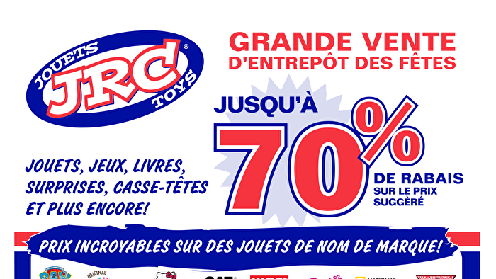 Magasinez vos cadeaux à la grande vente d’entrepôt de jouets JRC! Jusqu’à – 70% sur des jeux, jouets, livres, casse-têtes, etc. Pat’Patrouille, Hello Kitty, Marvel, CAT, Nerf, Pokémon, Playmobil, Mattel et plus.