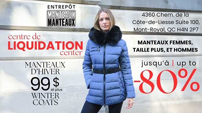 Obtenez jusqu’à -80% à la vente d’entrepôt Manteaux Manteaux. Magasiner des rabais sur des styles pour femmes, tailles plus, et hommes. Manteaux d’hiver en liquidation à partir de 99$, vêtements à -70% et marques comme Point Zero, Sicily, & Saki.