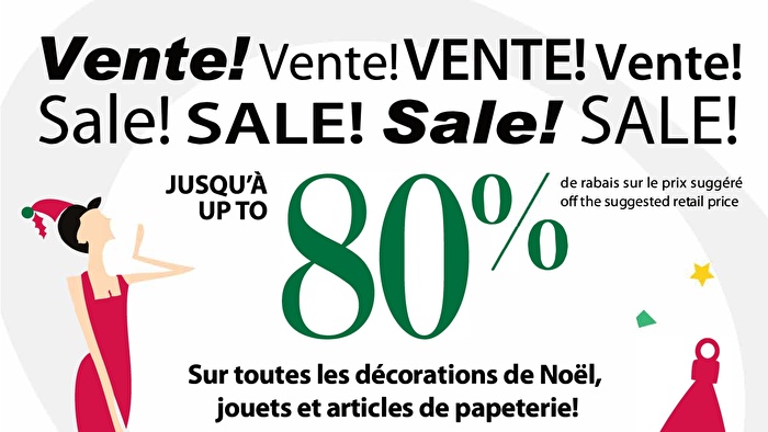 C’est l’occasion de se procurer des articles de Noël en solde. Rabais jusqu’à 80% sur les décorations de Noël, jouets, articles de papeterie, papier d’emballage, chandelles, cartes de Noël, pétards des Fêtes & plus