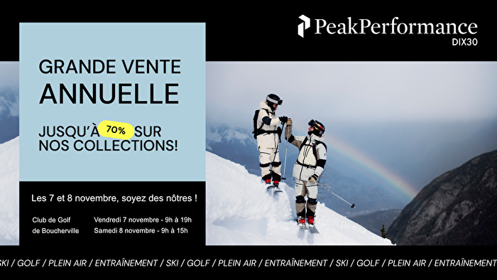 C’est le retour de la méga vente Peak Performance DIX30 Profitez de rabais allant jusqu’à 70% sur nos collections, ski, golf & plein air. 🤩
