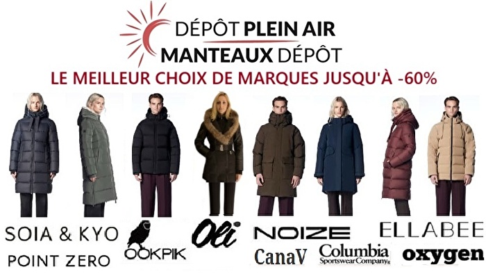 Jusqu’à -60% de rabais! Plus de 15 marques et 75 styles. Tailles XXS à 4XL pour Femme et Homme: Soia & Kyo, Arctic North, Ookpik, Columbia, Point Zero, CanaV, Oxygen, Diamond Trail, Noize, Liquid, Ellabee, Oli, BigChill, Misty Mountain, Motion…
