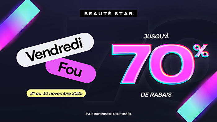 C’est le vendredi fou chez Beauté Star ! Économisez jusqu’à 70 % sur la marchandise sélectionnée. Ne manquez pas cette occasion unique pour faire le plein de vos produits de coiffure préférés !