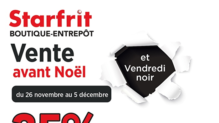 Passez à la boutique-entrepôt Starfrit pour notre vente d’avant-Noël! Profitez de 35% de rabais sur tous les articles en stock à prix régulier. Économies parfaites pour préparer les Fêtes! 🎄